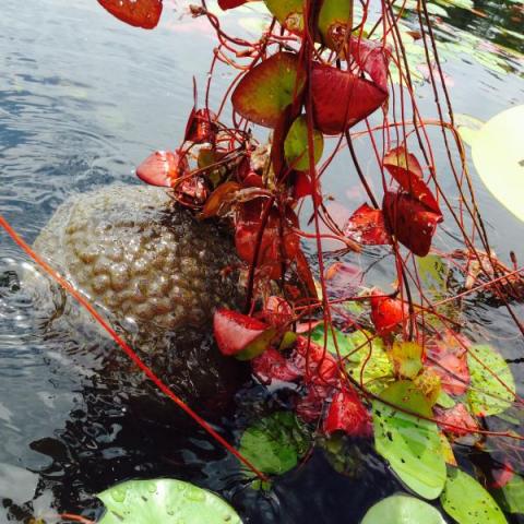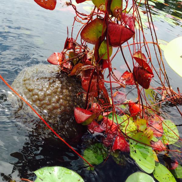 We kayaked in a pond where we have done so for the last almost 20 years, and saw something new to us! Where there are waterlilies growing, we saw grayish blobs floating just under the surface. When we got closer, we realized they were attached to the lily stems on one side. If we touched them they dropped and then floated back up. They felt slimy in the same way as the underside of the lily pads. They have convolutions just like a brain. Wild!!